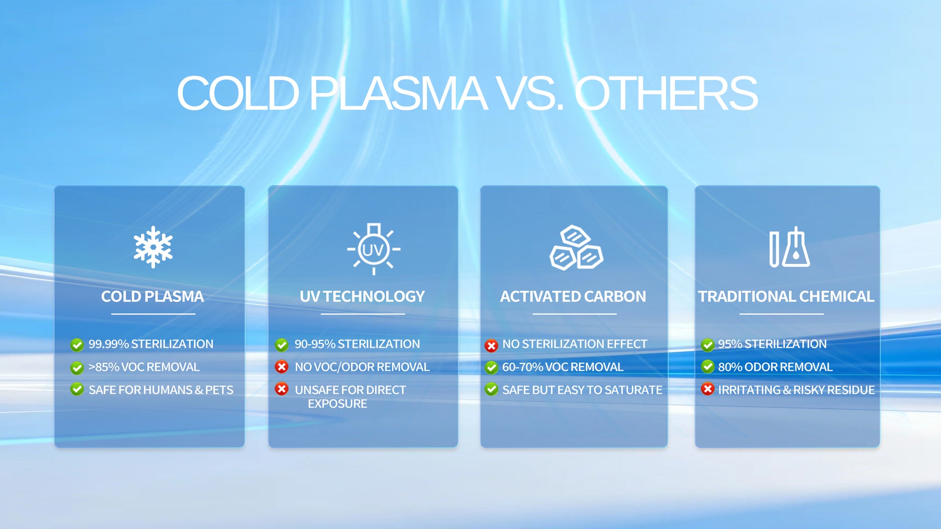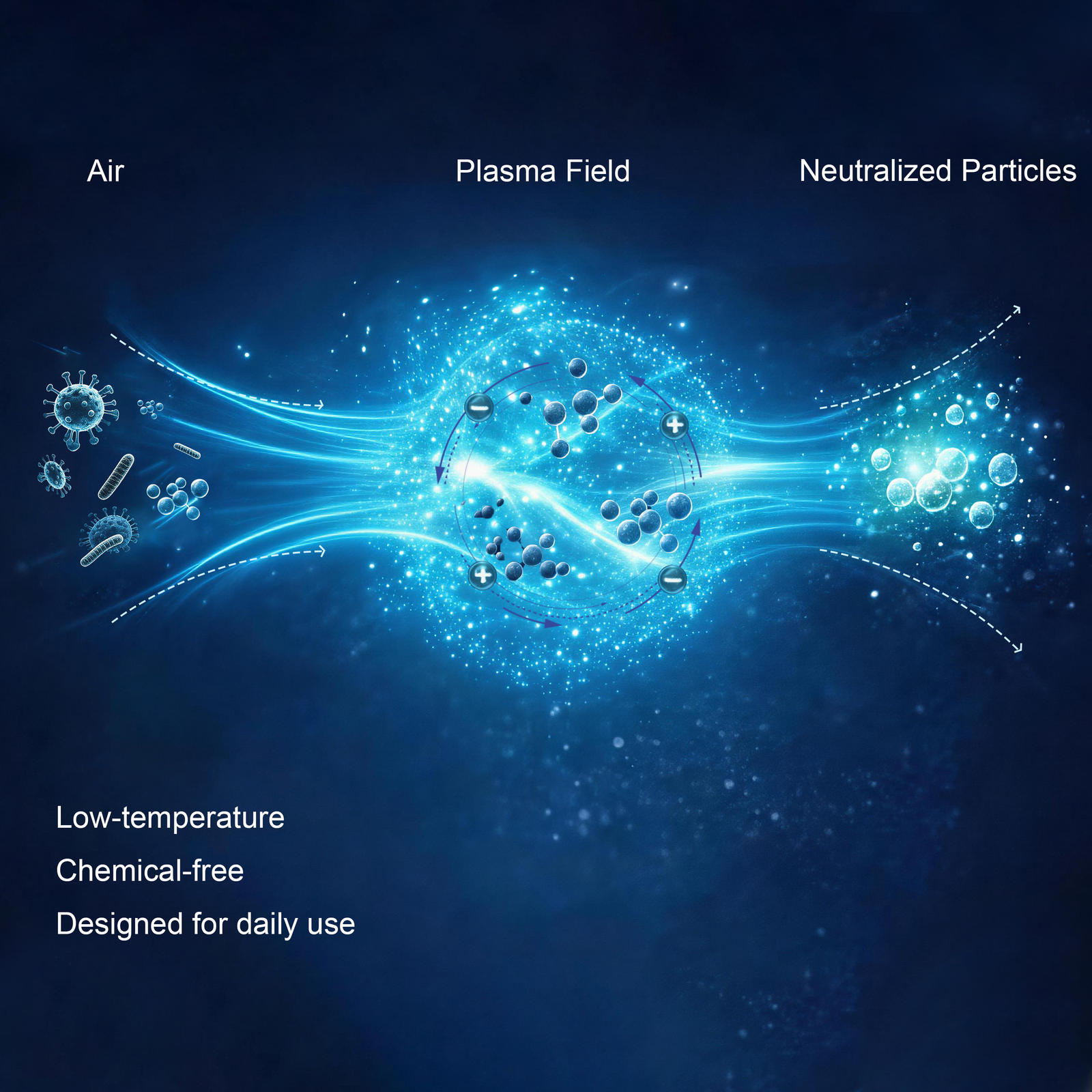 Our cold plasma technology uses reactive oxygen species (ROS), reactive nitrogen species (RNS), and high-energy electrons to break down odors, fungi, bacteria, and organic pollutants at the molecular level. It gradually destroys cell structures and converts contaminants into harmless substances: CO₂, H₂O, and N₂.